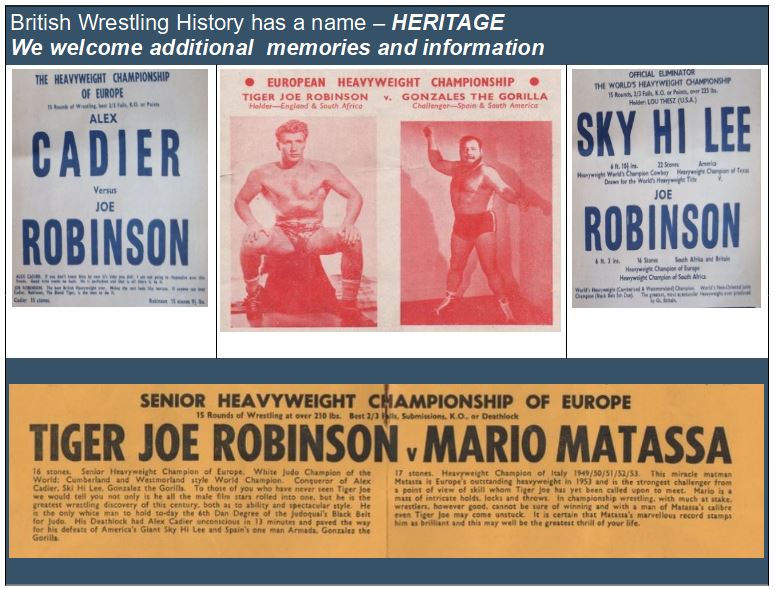 Doug Robinson took over the moniker of Tiger for the only pro match we can find for him in Britain (he was far better known in the Cumberland and Westmorland style). This was in November, 1954, when he defeated Mike Byrne at Harringay for the British Empire Heavyweight Championship in a contest promoted by Atholl Oakeley. Douglas Bowbank Robinson was born in Newcastle upon Tyne on 8th February, 1930. He followed his father and brother, both Joes into the world of wrestling and then filmwork. Doug made numerous film and television appearances and, along with brother Joe ran a very successful stuntman business, especially famed for work in James Bond films.