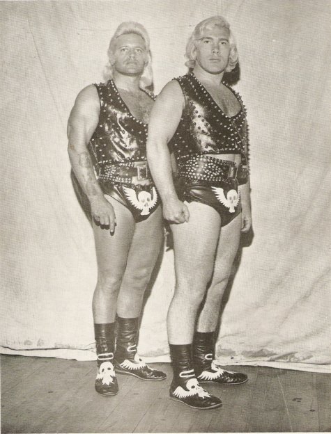 This time we didn’t provide biographical details in the countdown, you can find details on 92 of the above 94 wrestlers in the A-Z section – and quite possibly on all 94! We’ll just say that in the same way that fifties George Kidd created the mould for speedy technical wrestling, so the sixties Royals dedicated thought and training to perfecting original and entertaining routines that were emulated by others. The Black Diamonds, too, thought outside the box with their controversial wristbands, and were a near equivalent of the villainous kind. The Hell’s Angels were a sensational sight to behold but were only in regular team action for 3 or 4 years, otherwise they would surely have challenged the top two teams even more closely. The Caribbean Sunshine Boys may actually have reached the greatest infamy of all, and again it was their run of less than a year that held them back.
